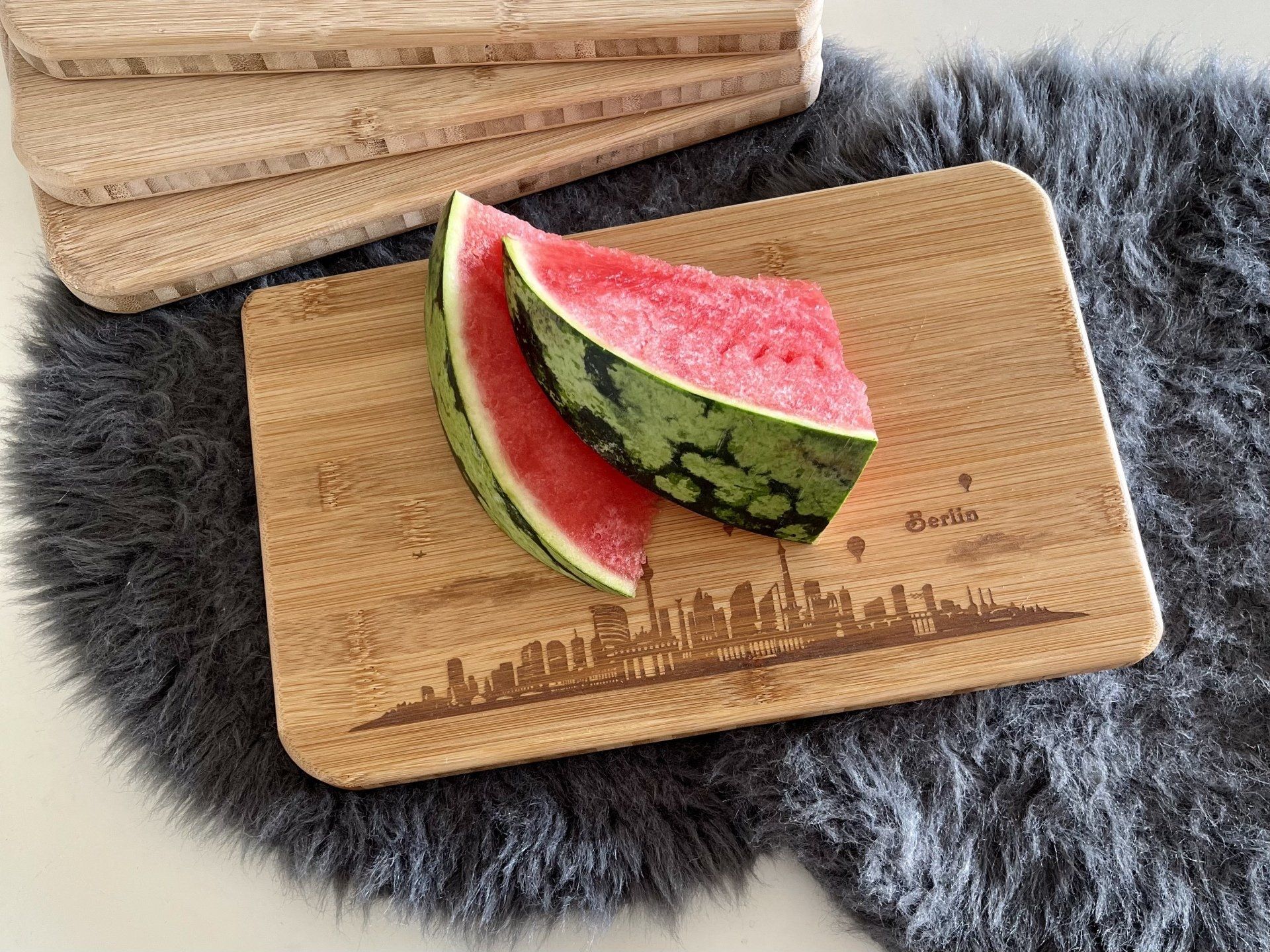Die drei hellen Brettchen auf dem Foto sind noch unbehandelt. Da Brettchen mit der Skyline wurde bereits geölt und gewachst.